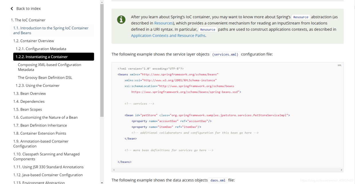 1.读取Bean配置信息放入Bean定义注册表 2.根据Bean注册表实例化Bean 3.将实例化之后的bean实例放入Bean缓存池(HashMap实现) 4.应用程序通过类名从Bean缓存池中取出Bean实例 看了这么多,我们还是来看看具体如何使用spring IOC容器来创建对象吧。首先,就像上面我的那个山寨IOC一样,我们要先来编写XML文件,XML比properties要复杂,不过好在我们暂时还用不到那么复杂的部分。首先先去官网的文档里面找一段模板抄下来: