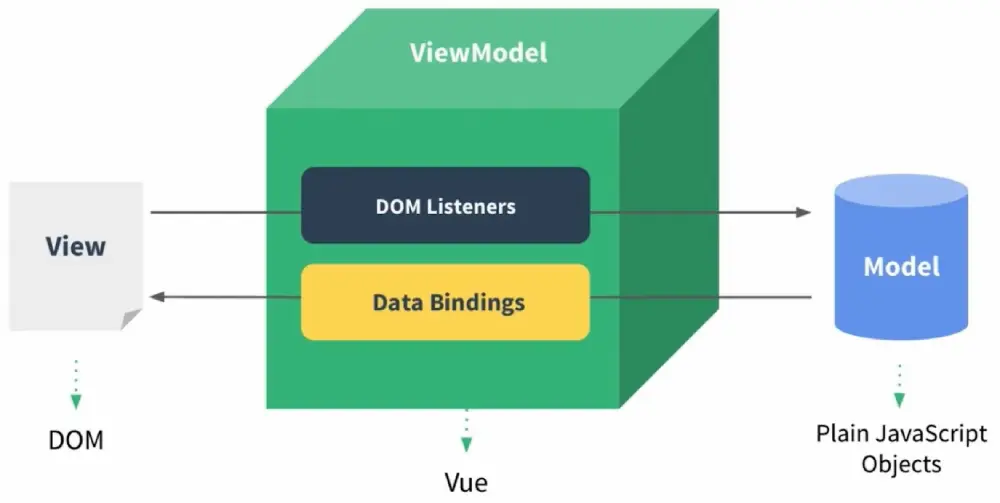 MVVM 是 Model-View-ViewModel 的简写,M 表示模型层(存储数据), V 表示视图层(显示数据) , VM 表示视图模型控制层(Vue 框架自带,开发时无需关注具体实现)。