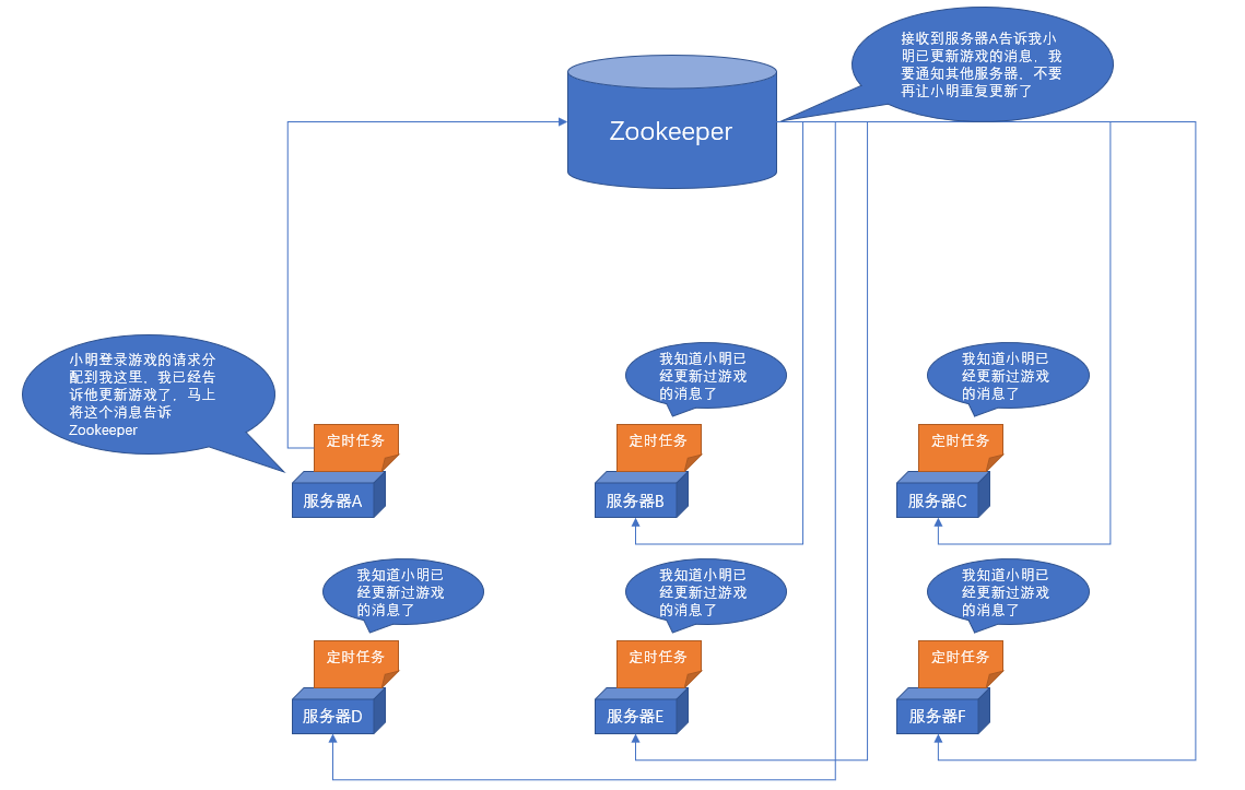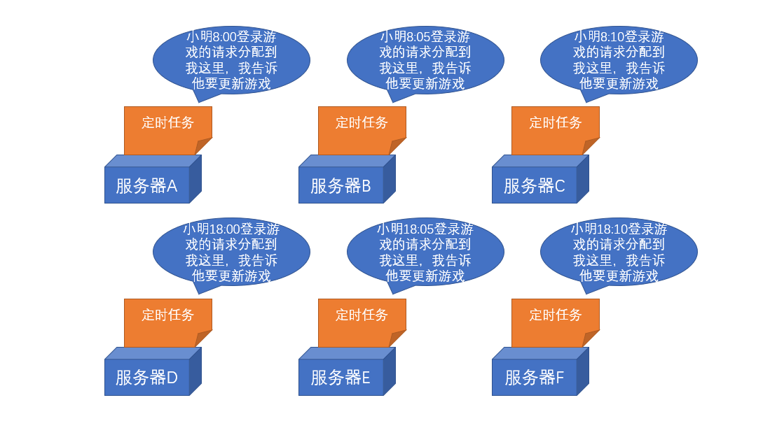 举个例子,当前我有个游戏系统,我写了个定时任务:每周周日0点更新一个版本,次日8点通知用户更新游戏。写完后我将其部署到分布式环境下的各个服务器,理想状态是到了每周一的8点,用户就会被提示更新游戏。
