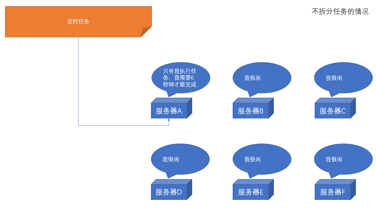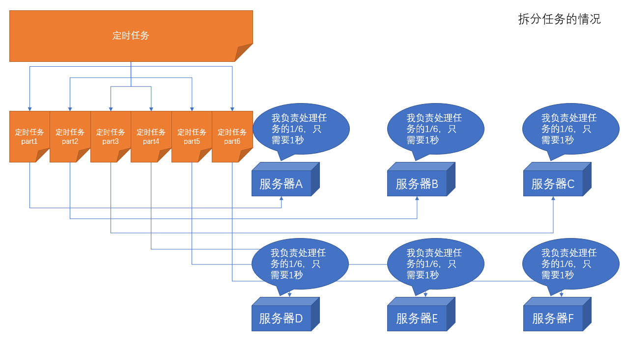 举个例子,我有一项定时任务需要在某一时刻去进行一百万次计算,那么如果这项任务能被拆分为若干个小任务,同一时刻由若干台服务器去执行,那么每台服务器需要处理的任务都比不拆分时由一台服务器处理的任务少,整体效率就上去了。这就是分布式调度的含义之二:把一个大的任务(作业)分为若干个小的任务(作业),同时执行