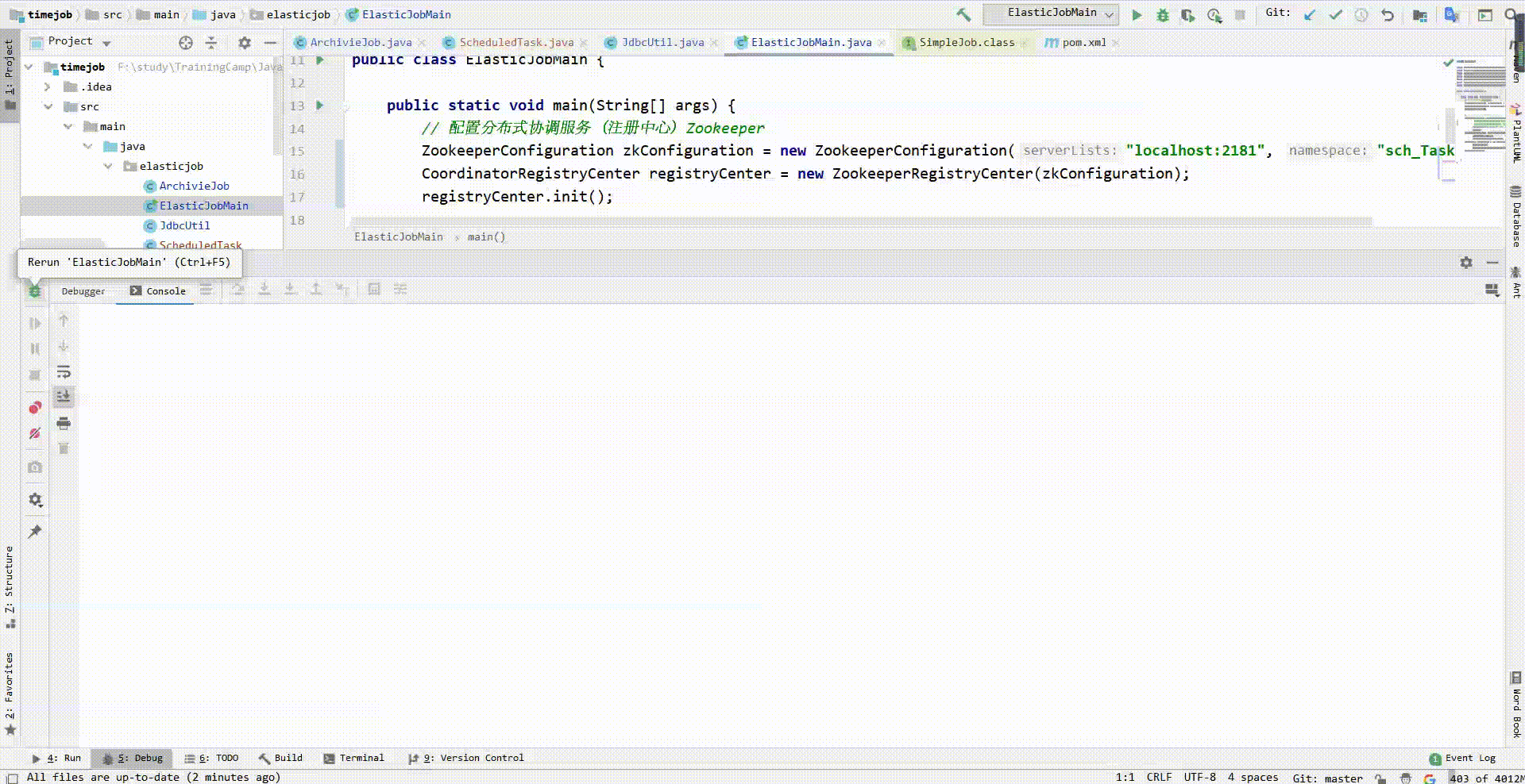 定时任务写好了,得有人去调它。这里就编写一个调度中心类ElasticJobMain模拟运行时机已到去执行定时任务,本调度中心的执行逻辑是每1秒执行1次任务。配置Zookeeper的内容依然不是本篇中心,不赘述。