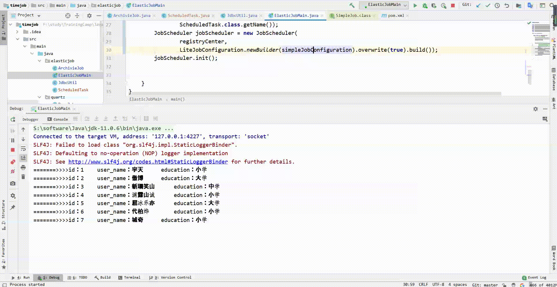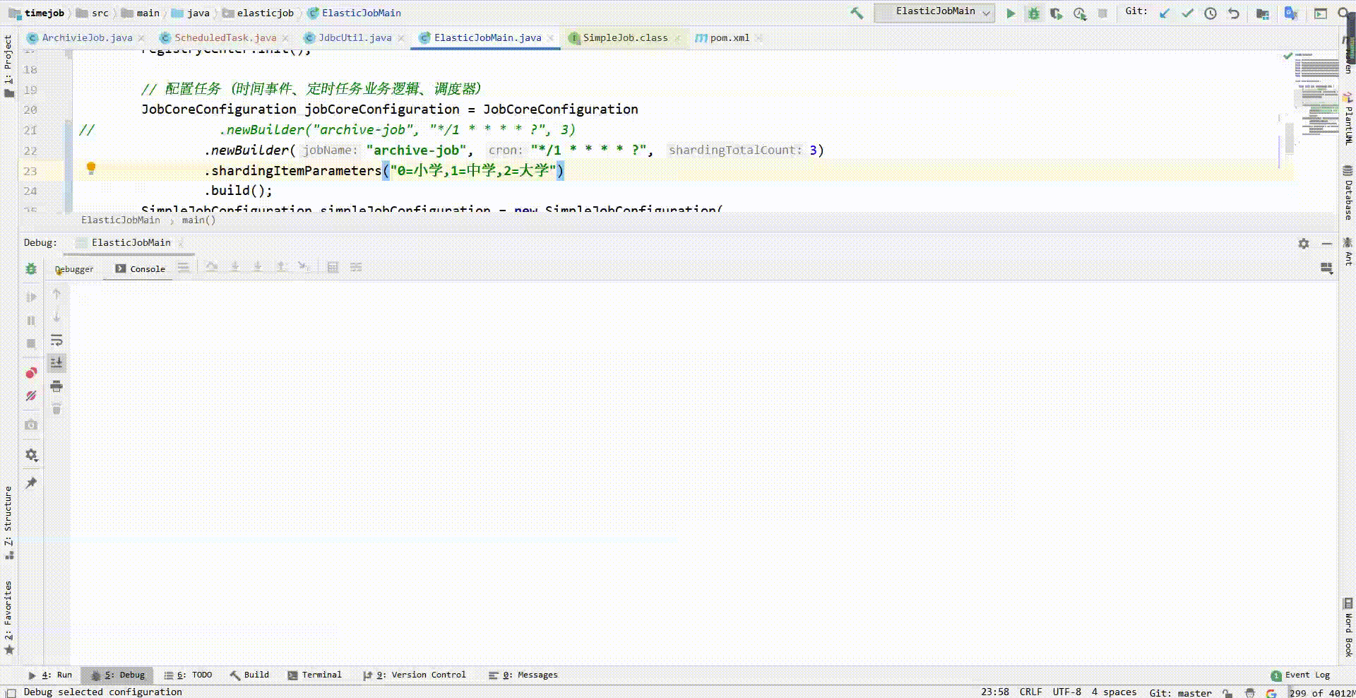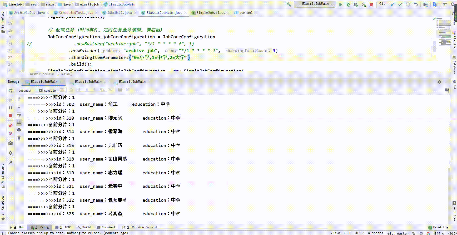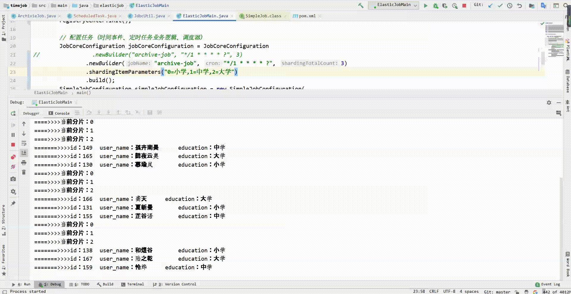 现在我要修改调度逻辑:将每秒的要执行的1个大任务分为3个子任务。每个小任务都有所标识,这里我打算使用education字段作为标识,于是使用shardingItemParameters方法添加分片标识,以0为小学、1为中学、2为大学: