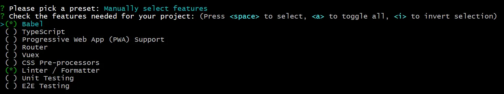 ? Check the features needed for your project: (Press <space> to select, <a> to toggle all, <i> to invert selection)
