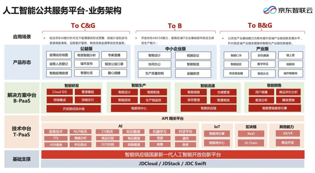 京东的智能供应链就是以人工智能算法为核心,通过在生产、流通、消费的全环节的智能化能力的输出,全链条提升人货匹配效率。京东的供应链平台,在应用服务层,提供应急管理、产业创新、KA 企业方面的赋能;在平台产品层,提供智能供应链管理平台、智能C2B平台以及供应链企业信息管理平台等等相关平台化产品,在能力层,则有大数据分析能力、AI 能力、云计算来提供相应的技术支撑。
