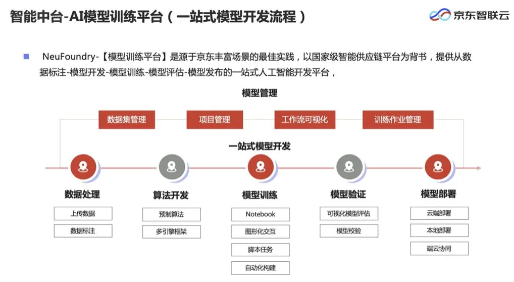 什么是 NeuFoundry?它是京东智联云基于京东丰富的业务场景,以国家级的智能供应链平台为背书,为企业定制的智能中台。NeuFoundry 覆盖从数据标注-模型开发-模型训练-服务发布-生态市场的人工智能开发全生命周期,并预置高净值的脱敏数据、经实战验证的成熟模型以及典型项目场景,同时提供多种安全、灵活可定制的部署及交付方案。