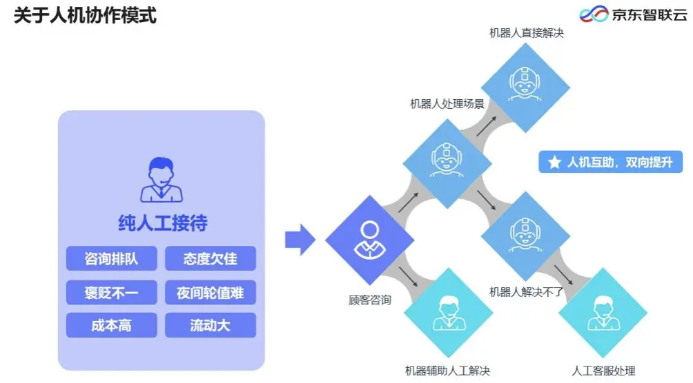 以京小智为例,它通过智能应答系统,能够回答用户提的各种问题。当它觉得足够自信时,会直接回复。即:机器优先模式。同时,京小智还有一种模式,即:辅助人工模式,也叫“人机协作模式”。具体来说,当客服在线时,可以选用人机协作模式,它会提供答案供工作人员参考,加快客服人员回复效率。