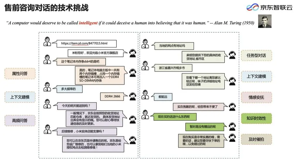 售前咨询对话这个问题与其他的自然语言处理任务相比不一样,需要让机器考虑上下文,涉及到上下文建模的问题;以及任务型对话,如:需要系统做查询才能给出答案的场景;还需要考虑到用户情绪进行智能回复,以及对问题时效性的保证。