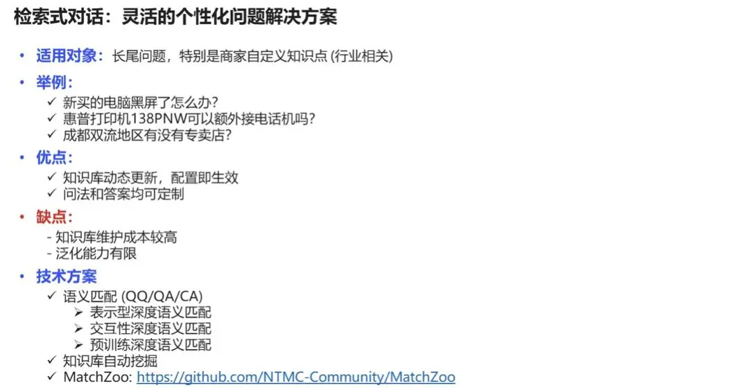 举例来说,分类器主要适用于高频的或者答案相对固定的问题,优点是对头部问题的覆盖非常直接,缺点是在分类错误的情况下,更新不是特别灵活。检索式对话则提供灵活的个性化解决方案,适用于商家自定义的长尾问题,优点是问法和答案都可定制,非常灵活,缺点是泛化能力有限。