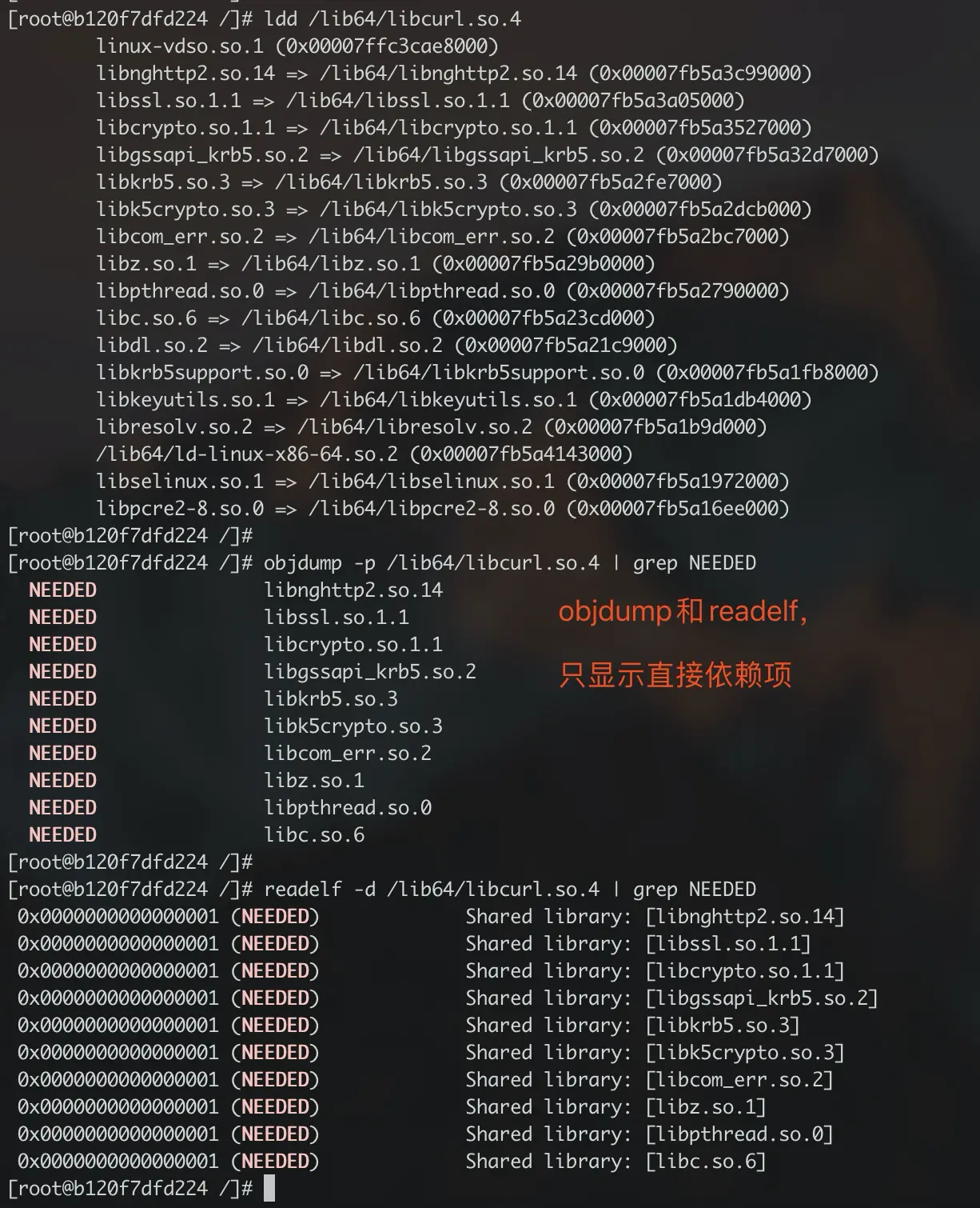 链接器会将直接依赖项的列表(在构建过程中,链接器命令行指定的那些动态库)写进二进制文件的ELF格式字段中。在分析加载依赖项时,ldd首先会扫描二进制文件并找到这些链接库信息,并递归查找间接依赖项、去除重复项。