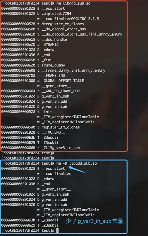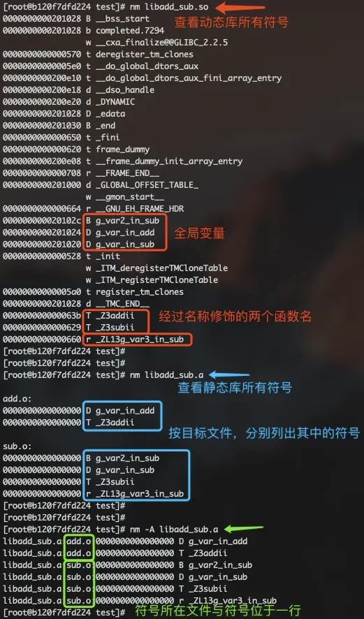nm <二进制文件路径>。如果二进制包含C++代码,默认打印经过名称修饰之后的符号名(通过-C选项打印没有经过修饰的符号名); - 只列出动态节中的符号(只针对共享库使用,共享库的导出符号、对外可见的符号)