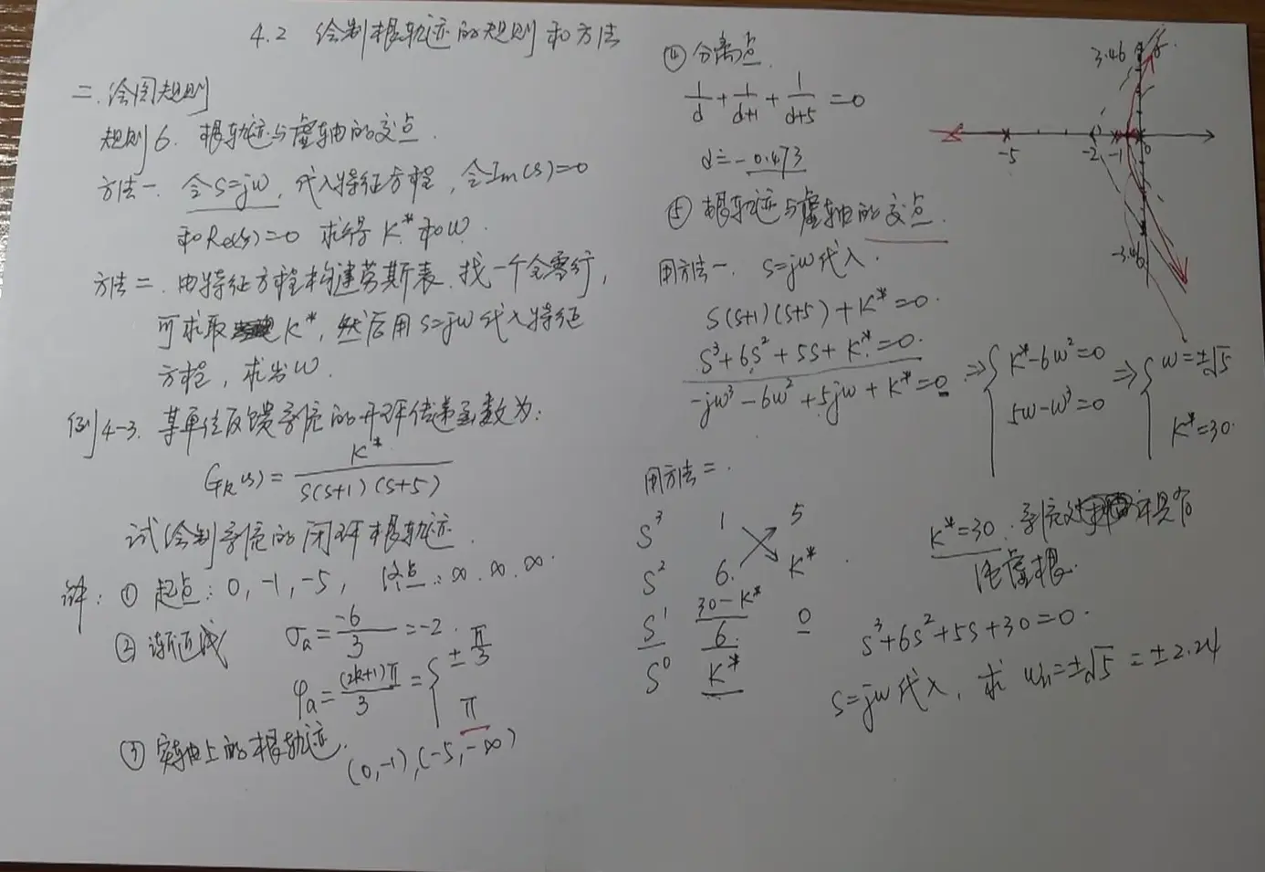 Rule6:解出根轨迹和虚轴的交点:s=jω代入1+GH=0令实部虚部为0解出ω;与虚轴交点得出的K就是临界稳定K值