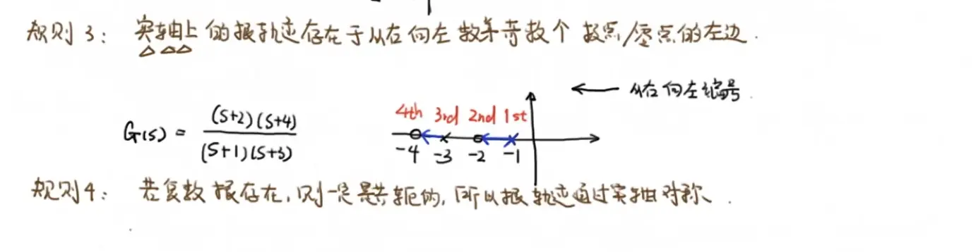 若有复数根: Rule5:仅对复数根使用:(极点的)出射角=180-极点+零点;(零点的)入射角=180-零点+极点(技:关于实轴对称,只求一边)