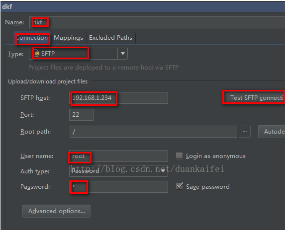 配置连接服务器,name随便写,connection下,协议sftp,服务器主机IP,用户名,密码,apply