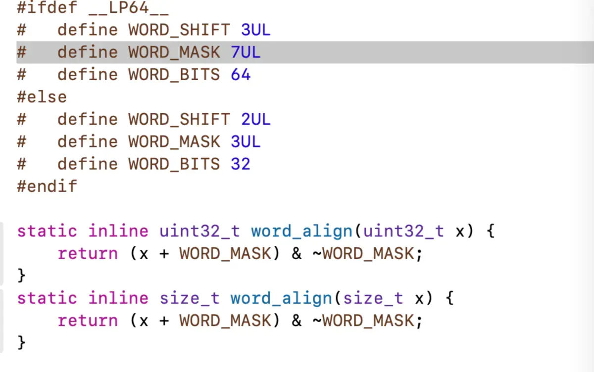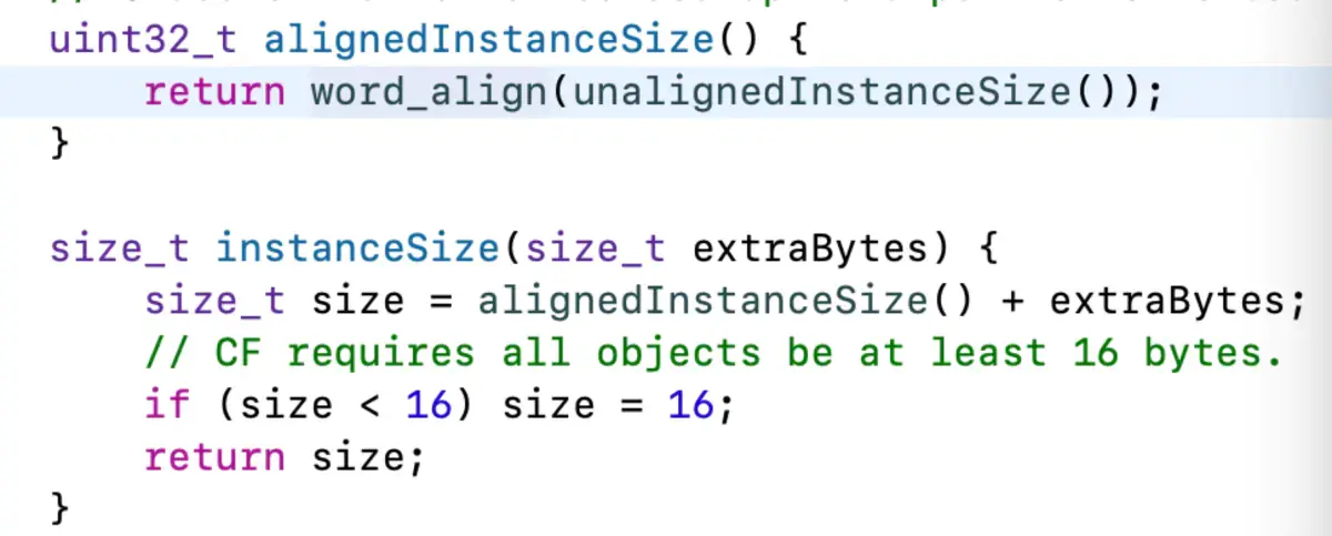 看到instanceSize 这个方法,这就是分配内存空间大小的方法,点击进去,会看到这里做了一次内存对齐的操作,具体算法如下:(x + 7) & ~7,因为对象开辟空间时候,会自带8字节的isa指针,所以这里的x最小为8。