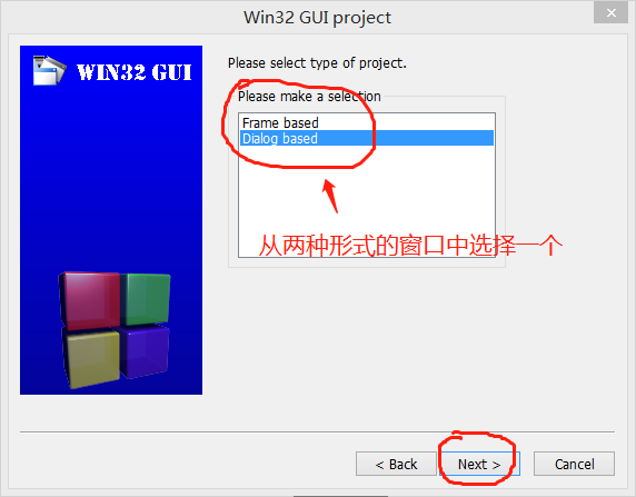 提供两种窗口类型,具体意义以后解释,现在随便选择一个就可以了(比如选择Dialog based)。