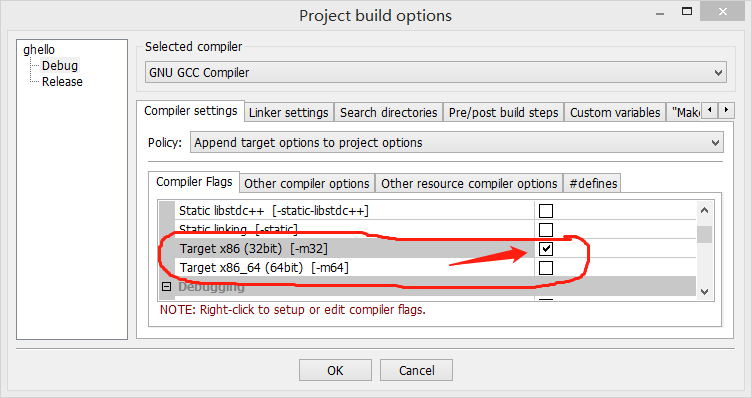 勾选其中32bit的,然后点击[OK],关闭构建目标选项窗口。