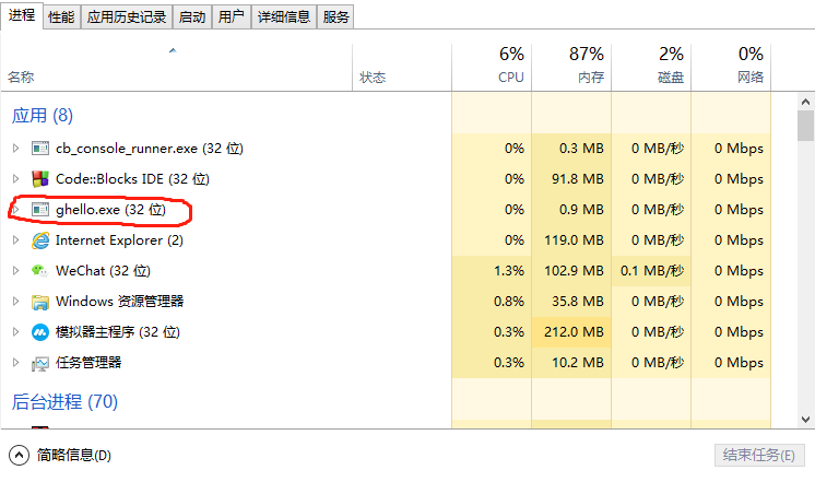 你会发现重新编译后在第四步的任务管理器窗口中gheloo.exe后的括号没有了,说明编译生成的应用程序是64bit的了。