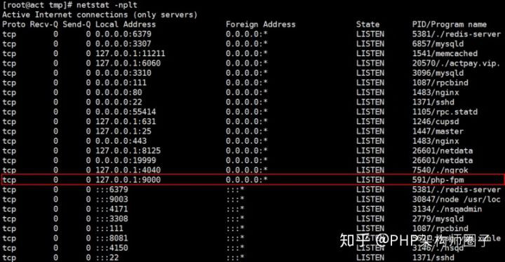 }这里 fastcgi_pass 就是把所有 php 请求转发给 php-fpm 进行处理。通过 netstat 命令可以看到,127.0.0.1:9000 这个端口上运行的进程就是 php-fpm。