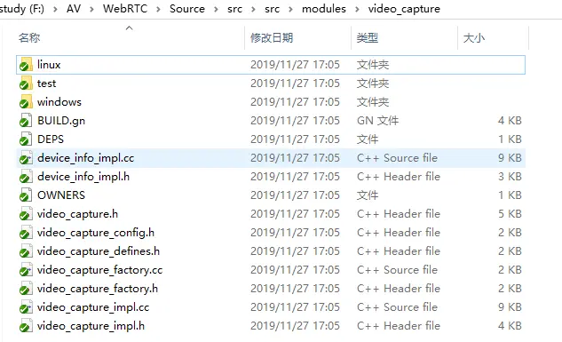 视频采集模块是平台相关的模块,MacOS/IOS一般使用AVFoundation框架或者QuikTime框架,Linux平台一般使用V4L2库,Android上一般使用Camera1或者Camera2框架,Windows平台则使用DS(DirectShow)或者是MF(MediaFoundation)。由于WebRTC是个非常活跃的工程,代码架构一直在不停的变动之中,比如2019年4月份的代码还有VideoCaptureMF的代码,并且还注释着Vista及以上的版本建议使用MediaFoundation采集框架,而2019年11月份的代码MediaFoundation相关的代码已经被移除。再比如MacOs/IOS,Android的相关代码已经被移动到sdk/objc和sdk/android目录下。本文以modules/video_capture下的代码来做阐述,平台无关的代码在该直接目录下,平台相关的实现在modules/video_capture/windows,modules/video_capture/linux目录下,如图所示: