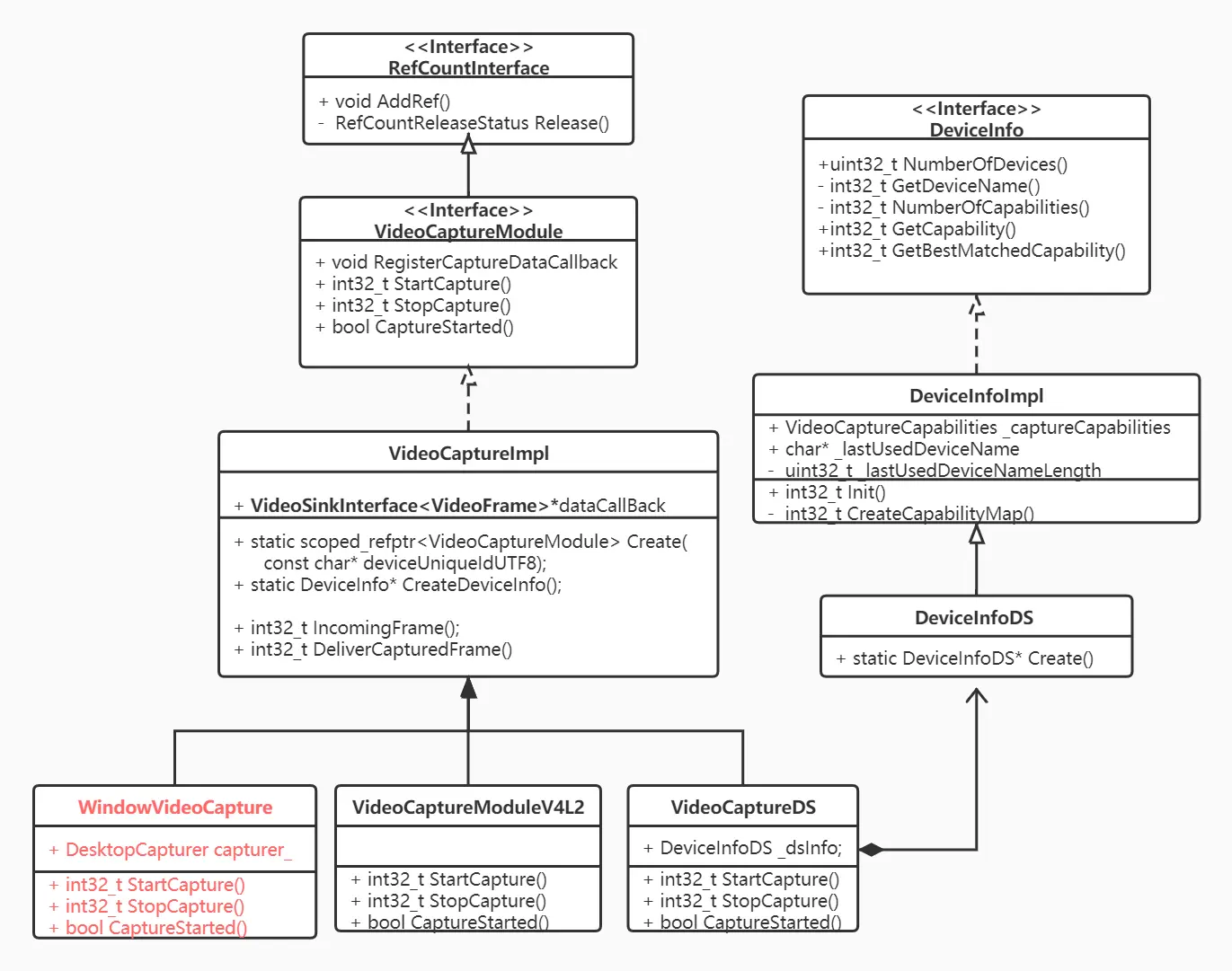 DeviceInfo接口提供了设备枚举相关功能,其平台相关子类实例以组合的形式提供给VideoCapture。