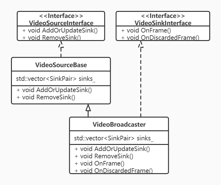 一方面VideoBroadcaster实现了VideoSinkInterface接口,成为一个Sink,这样VideoSource得到采集模块的视频帧后,首先会流入到内部的VideoBroadcaster成员对象,而非直接从VideoSource流出;另一方面VideoSource和VideoBroadcaster都实现了VideoSourceInterface接口,对外VideoSource作为视频源存在,向数据流下一站提供注册方法AddOrUpdateSink();该方法内部调用VideoBroadcaster的AddOrUpdateSink(),从而将数据流下一站VideoSink注册到VideoBroadcaster,存入成员std::vector<SinkPair> sinks_中。到此,应该不难想到VideoBroadcaster既有了数据流入,还知道数据的下一站(可能多个),那么VideoBroadcaster::OnFrame()中就可以通过循环调用下一站的OnFrame方法将视频帧广播出去。为什么要如此设计?因为,在WebRTC 1.0的官方规范中说明了一个视频源是可以被多个视频轨共用的。通过上述方式可以实现共用的概念。