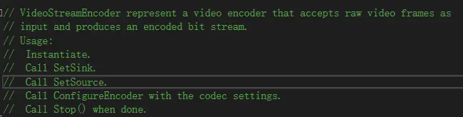 在WebRTC中VideoStreamEncoder类表征着一个视频编码器,接收原始视频帧作为输入,产生编码后的比特流作为输出。该类位于src/video/video_stream_encoder.h中,如下截图为该类的说明: