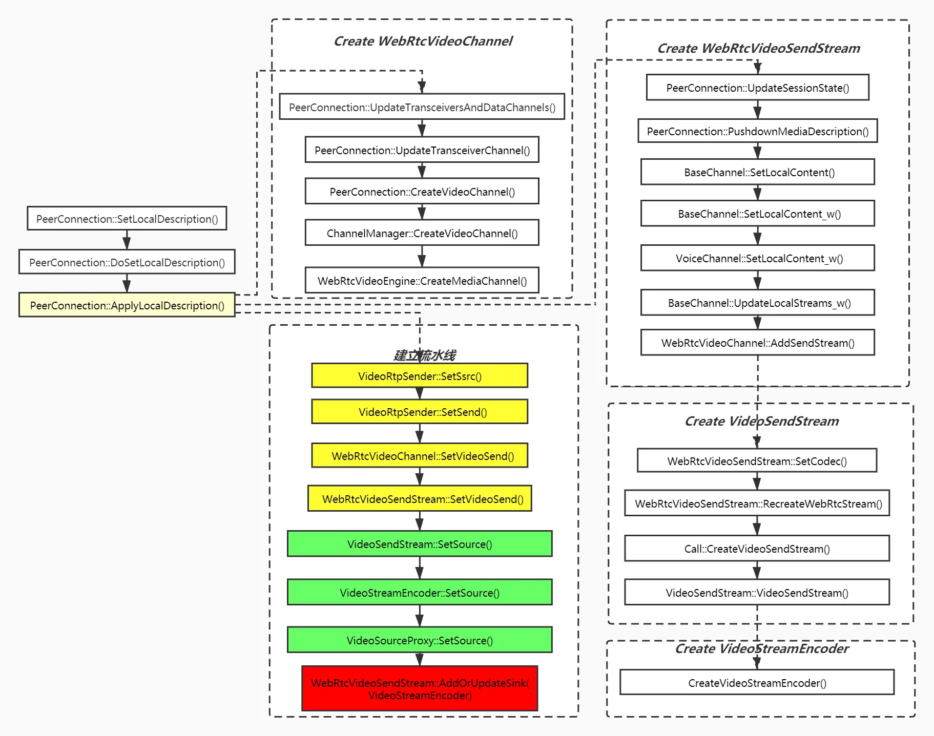 如上图, SetLocalDescription()过程是相当复杂的,我们抓住视频流水线上关键节点的创建以及关联过程来进行重点描述。重点函数在上图中都标黄显示。