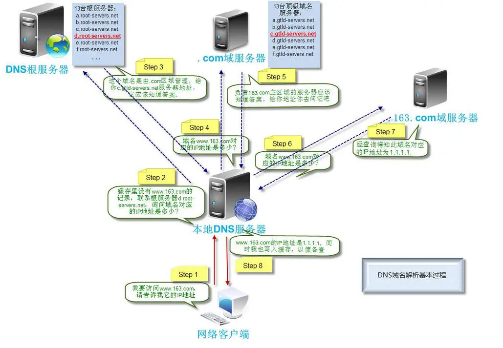 - 查询你输入的网址的DNS请求到达本地DNS服务器之后,本地DNS服务器会首先查询它的缓存记录,如果缓存中有此条记录,就可以直接返回结果,此过程是递归的方式进行查询。如果没有,本地DNS服务器还要向DNS根服务器进行查询