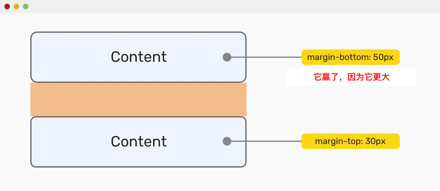 在上面的模型中,一个元素有 margin-bottom,另一个元素有 margin-top,边距较大的元素获胜。