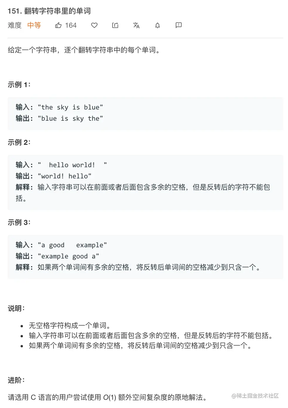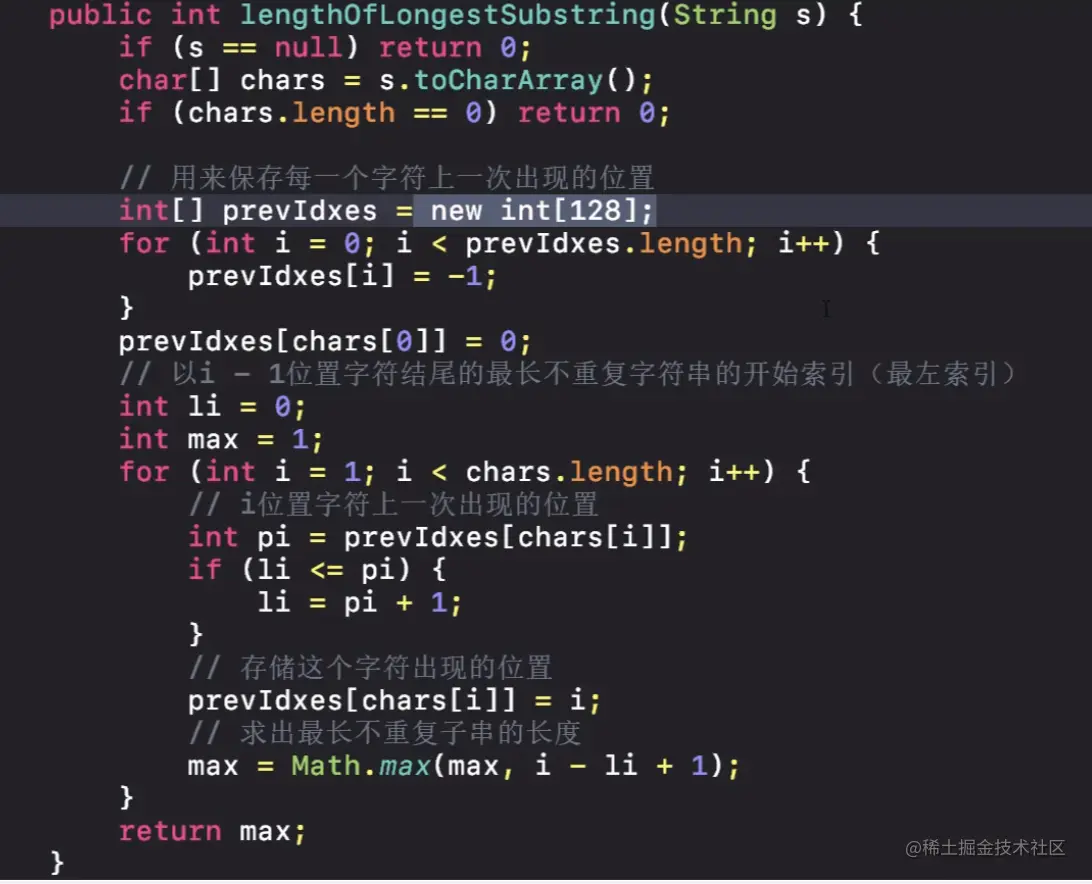小码哥《恋上数据结构与算法第三季》笔记(六):百度、阿里、腾讯、京东等面试题01 逍遥归来 2020-05-07 973 阅读1分钟 我的Github地址 小码哥《恋上数据结构与算法》笔记 极客时间《iOS开发高手课》笔记 iOS大厂面试高频算法题总结 iOS面试资料汇总 第一题:151. 翻转字符串里的单词 一、题目描述 二、思路 首先消除字符串中多余空格。 通过i指针扫码,通过cur指针标示可以放字符的地方。 然后将字符串逆序,然后再对每个单词逆序。 三、代码实现 第二题:3. 无重复字符的最长子串 一、题目描述 二、思路 获取每一个字符最长无重复子串,最大值即为答案。 三、代码实现 动态规划题目...