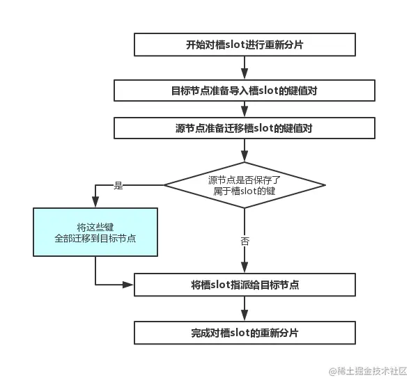 对Redis集群的重新分片工作是由redis-trib负责的,重新分片的关键是将属于某个槽的所有键值对从一个节点转移到另一个节点。