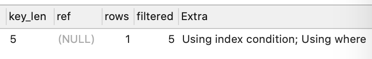 - Using where:不用读取表中所有信息,仅通过索引就可以获取所需数据,这发生在对表的全部的请求列都是同一个索引的部分的时候,表示mysql服务器将在存储引擎检索行后再进行过滤