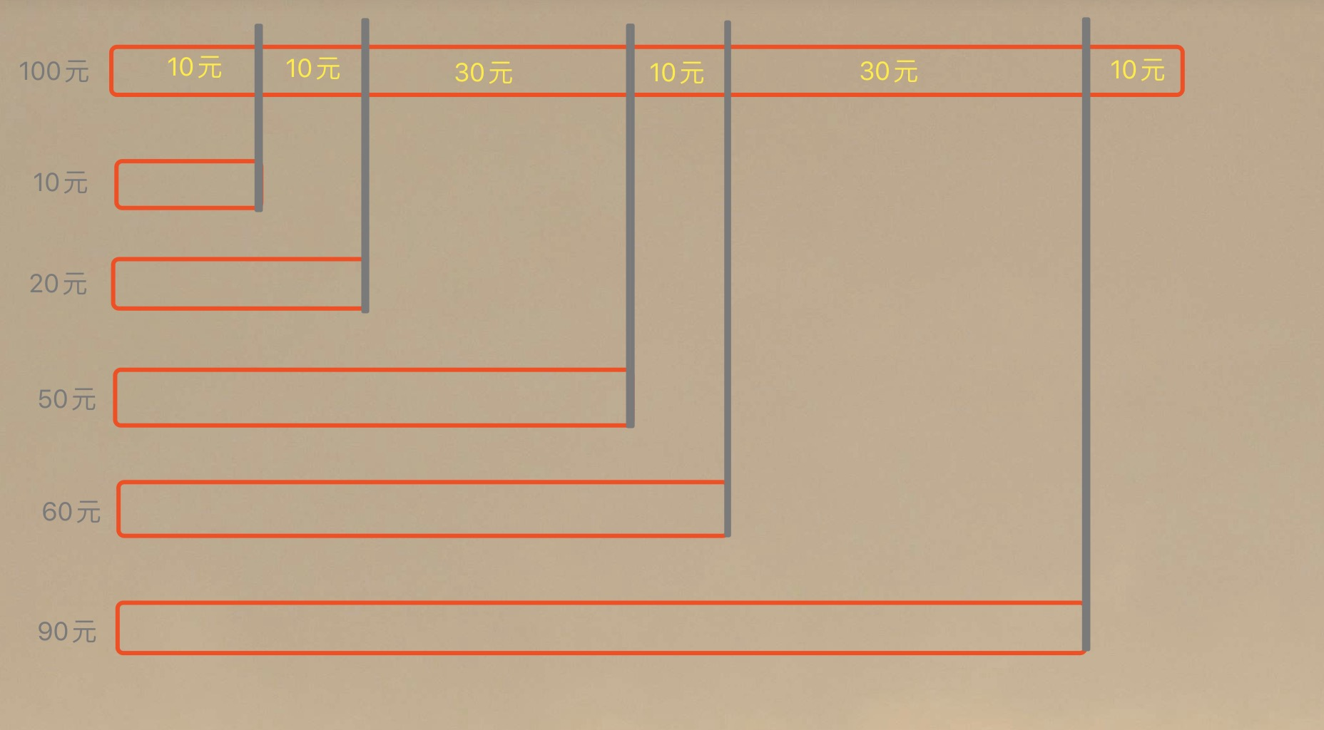 print_r($ret);代码中为何要进行所有随机值的排序?画图更容易理解一些。如图,我们通过 5 次的随机值结果正序减法,即将 100 元红包拆分为了 10 份。