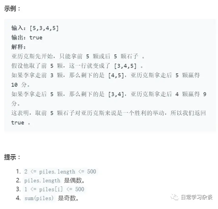 看到这个过程,相信很容易就能理解这个问题是如何将大问题拆解成子问题,其实在进行游戏的过程,石子堆数就一直在减少。相当于piles数组大小一直在减小,直到basecase。