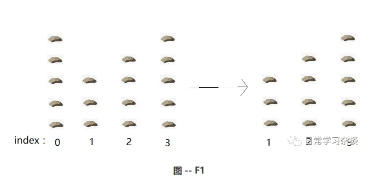 首先,状态定义方式在上面解释子问题存在性的过程中,就已经提示得很明显了。在图--F1中,左边和右边可以看成两个状态,观察这两个状态的不同之处?左边有四堆石头,索引从0-3;右边是三堆石头,索引从1-3。