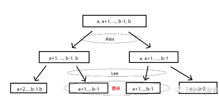 看着递归树,我们也就可以很容易地写出状态转移方程了(注意:Alex只在第1层 -> 第2层会得分,从第2层 -> 第3层是Lee得分)。