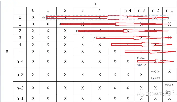- 因为题目告诉我们,给出的石子堆数总是偶数(题目提示2),所以每一次轮到Alex取石头的时候,剩余石子堆数总是偶数,所以像[0, 2]这种包含(0,1,2)三个元素的区间,我们就没必要考虑了,在循环过程中,可以直接跳过。当然也就包含[a, a]这样的区间了,所以对角线上的元素我们都没必要进行计算!