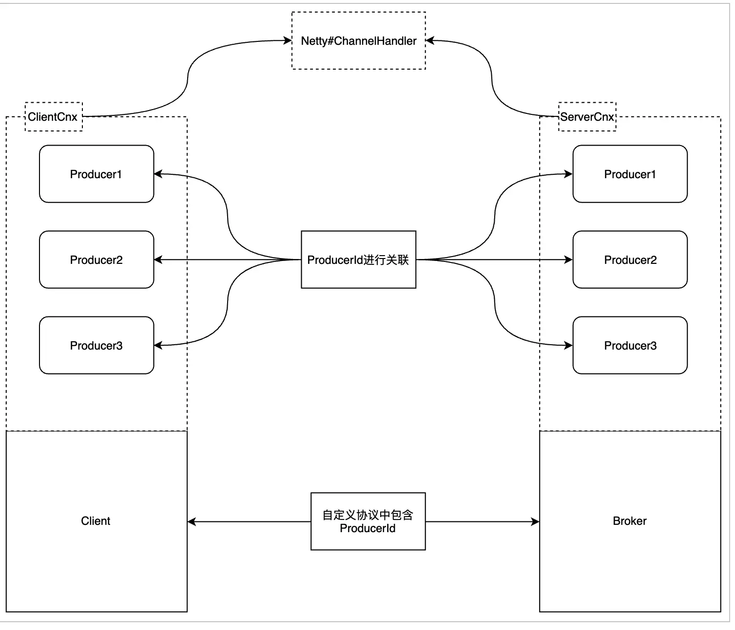 在Pulsar中producer创建的时候需要绑定一个topic,然后建立和broker的connection发送NewProducer的指令到broker。换句话说一个client有多少个topic需要发送消息就需要初始化多少个producer,但是connection可以是共享的,默认情况下所有的producer和consumer是共享在一个connection上的。这就有个问题client发送NewProducer到broker时就需要对该producer有个唯一的标识符来防止重复创建和在后续client和server交互时判断cmd用于哪一个producer,这个标识符就是ProducerId(不能使用topic)。这个ProducerId需要在该connection上保持唯一,目前是在client端使用AtomicLong生成。
