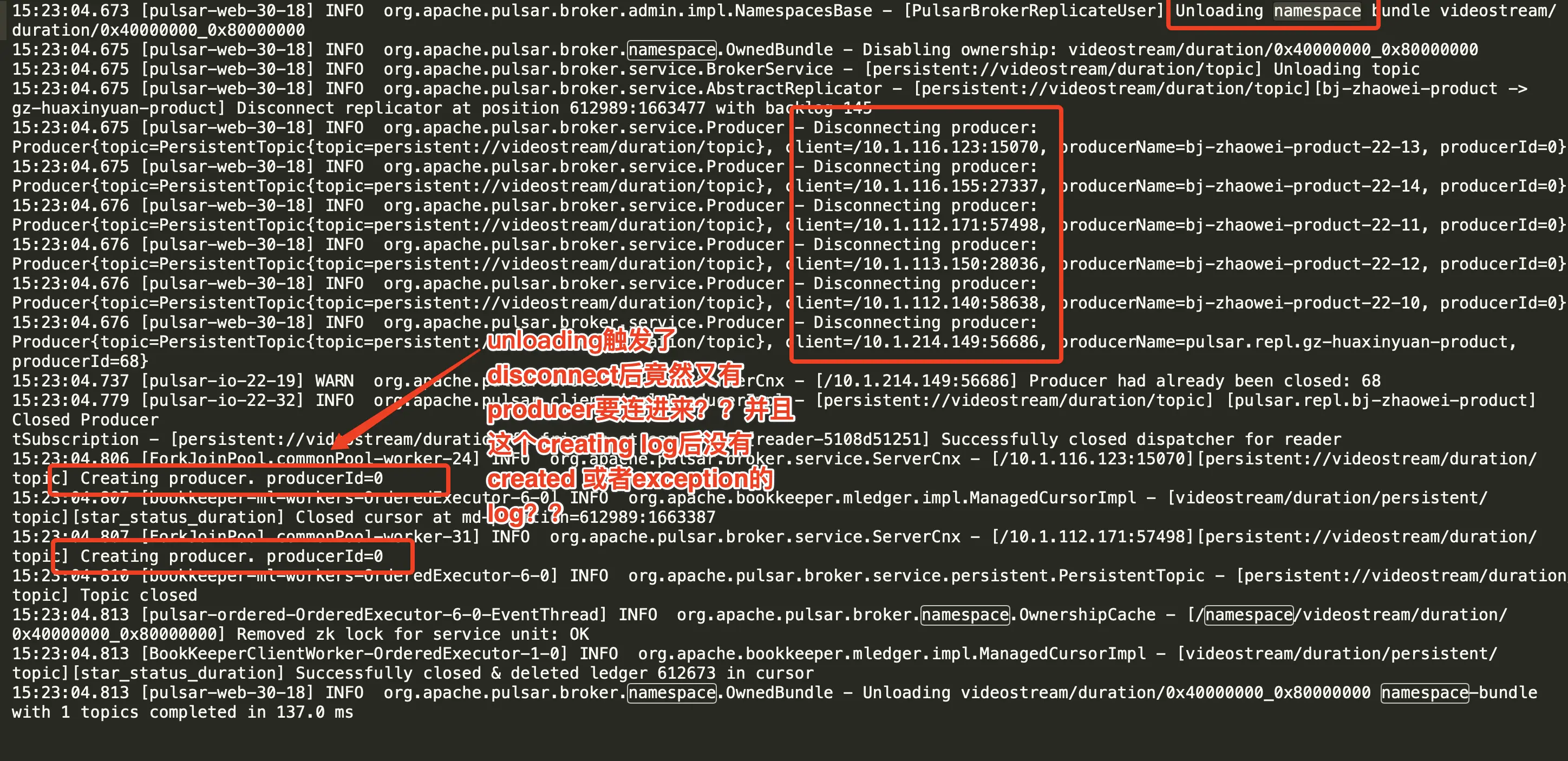 在unloading触发了producer disconnect后如果有producer要连接进来然后这个连接输出了creating producer了就没了后续,并且直接grep这个endpoint发现后续会一直Producer is already present on the connection。
