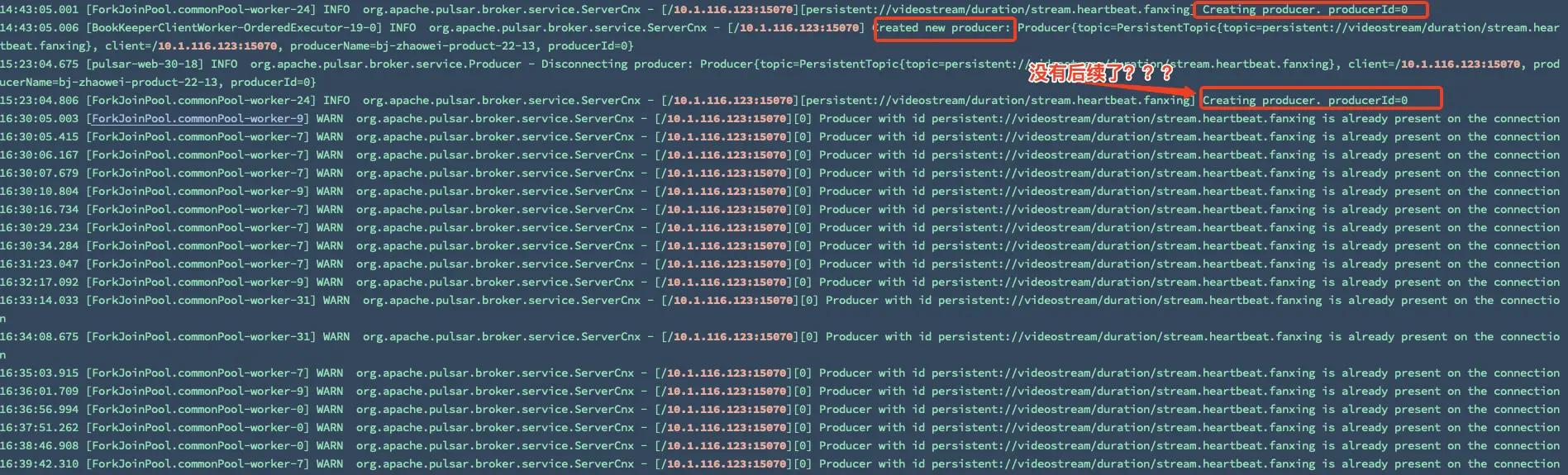 那为什么这个producerFuture一直无法完成呢,我简单看了下后面的创建逻辑,没有发现问题,然后就去log中看看有没有什么蛛丝马迹方便定位问题。