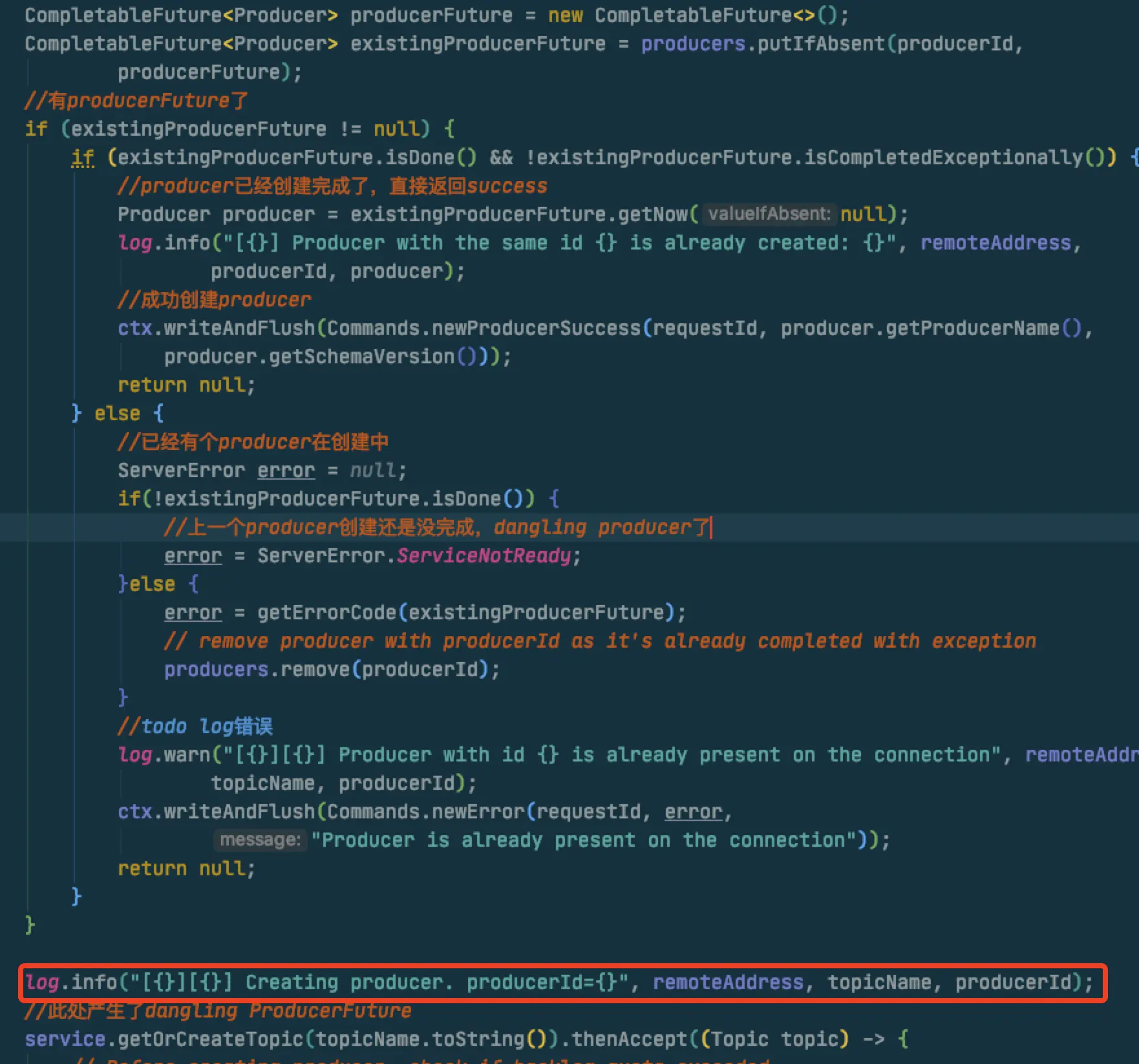 想清楚这个问题后我就根据creating producer的log定位代码,这个代码其实就是在put producerFuture后输出的。