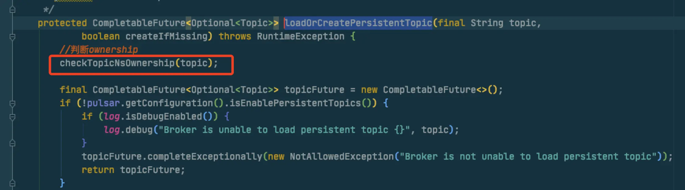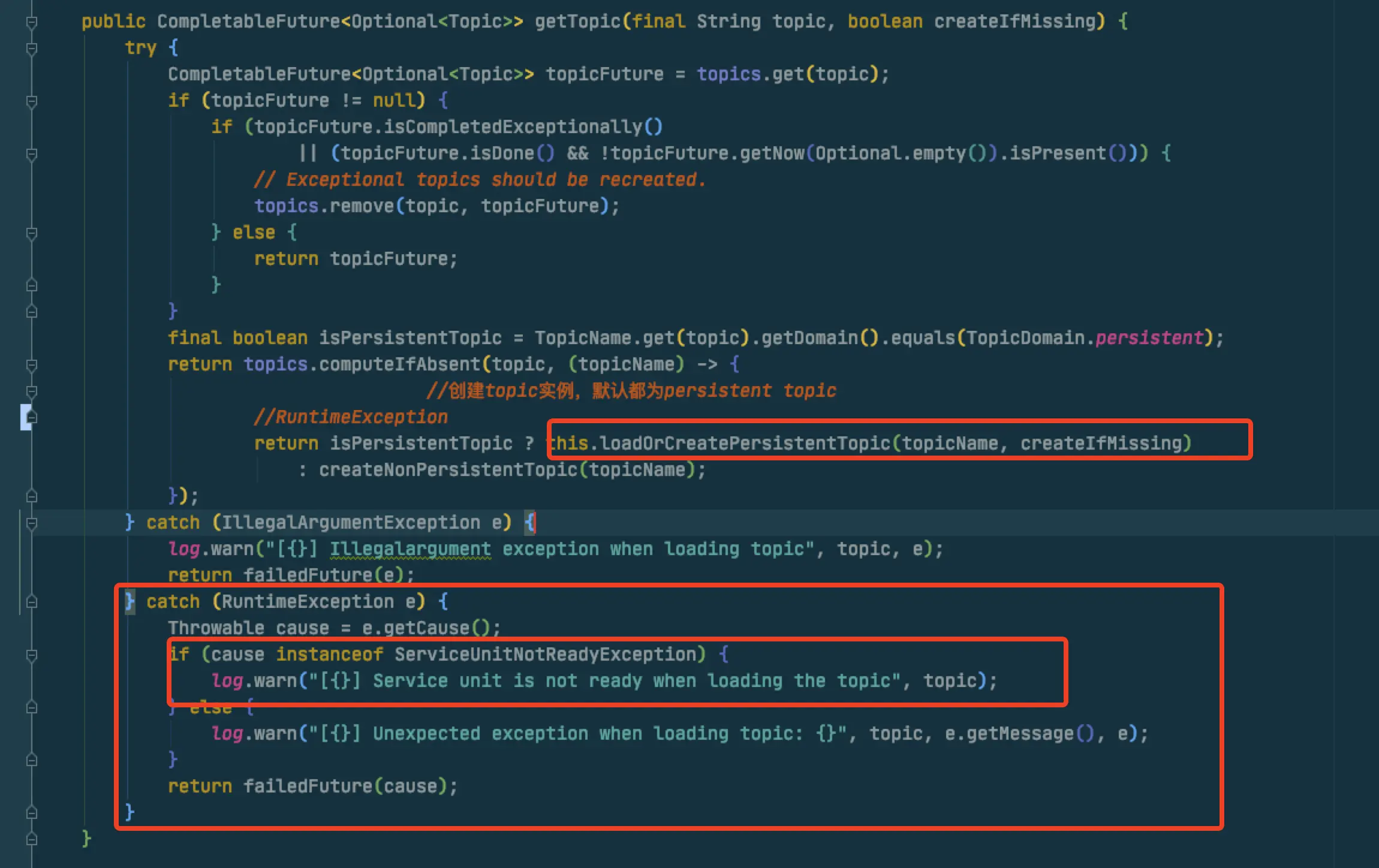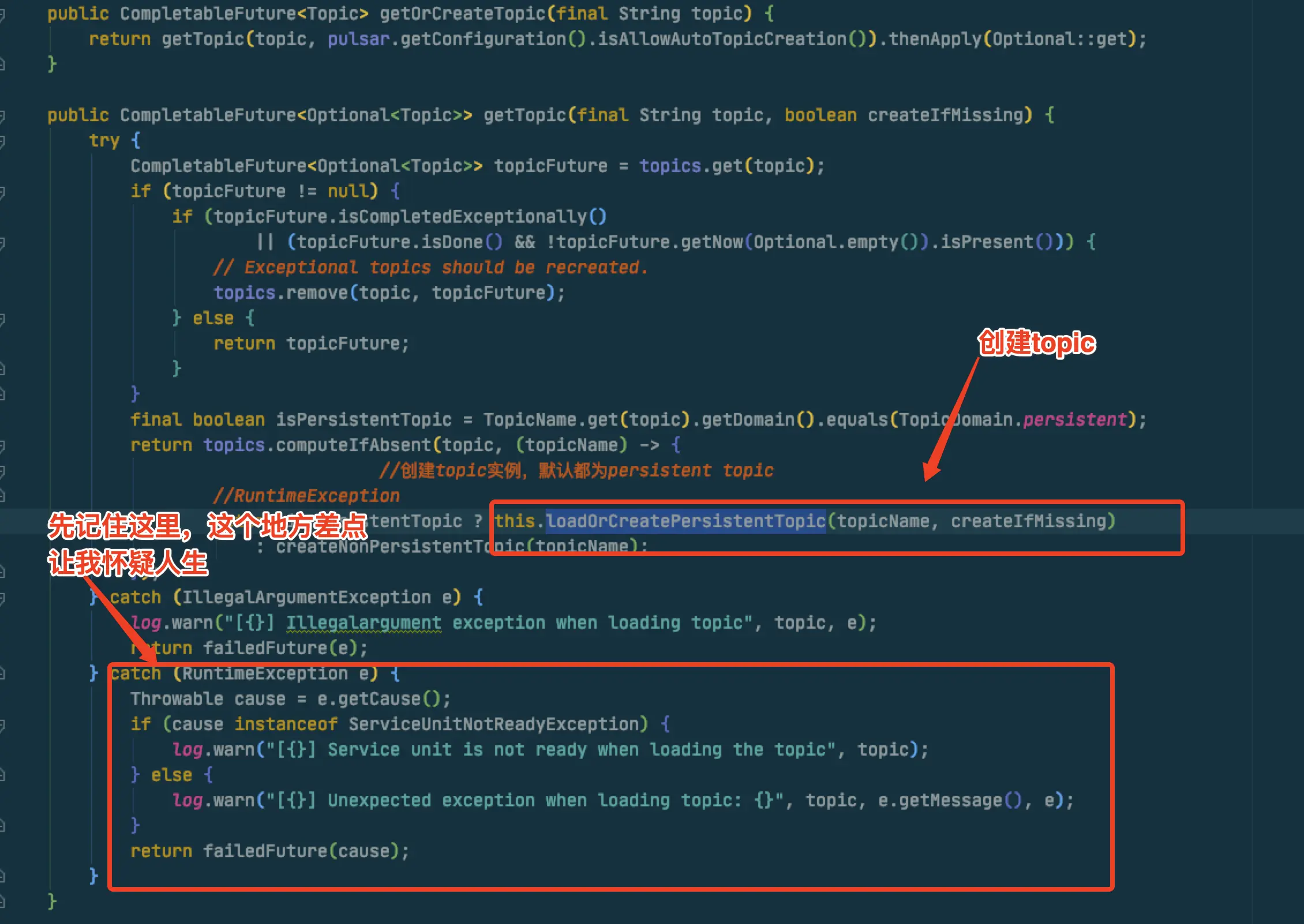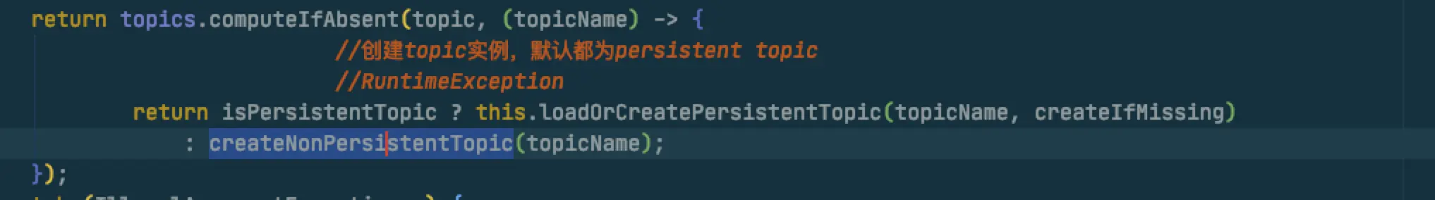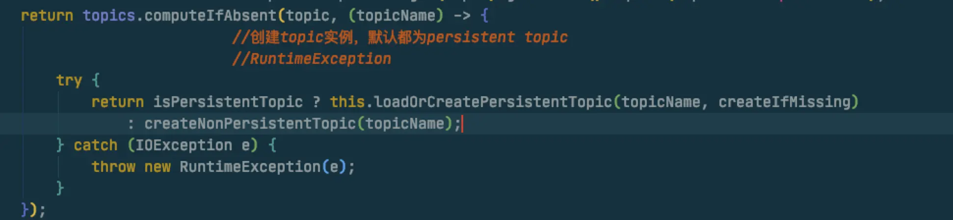 loadOrCreatePersistentTopic是抛出一个CheckedException,那在这里写起来就有点蛋疼,需要在lambda里捕获然后再抛出去RuntimeException,然后外层再处理,就有点丑陋,例如这个样子: