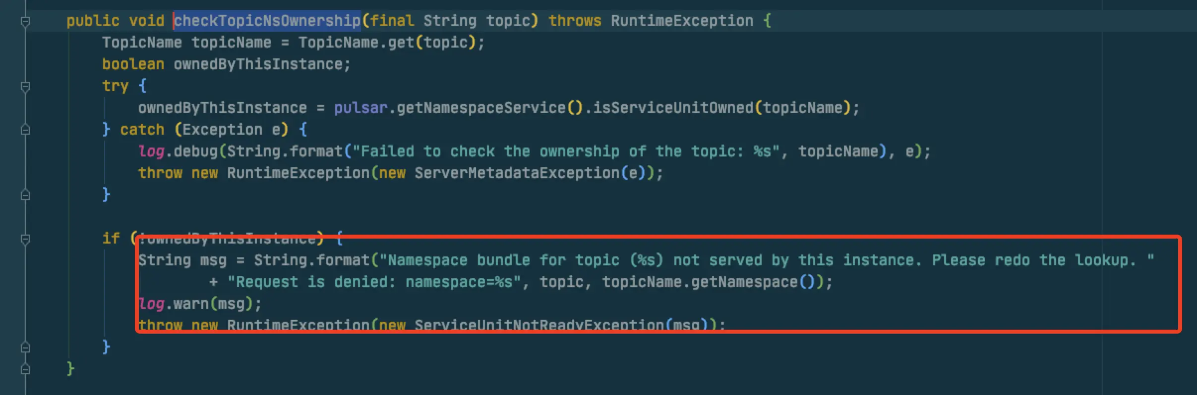 后来排查发现是由于Server端在NewProducer的处理过程中为了防止同一个Topic被多个broker所owner,会进行checkTopicNsOwnership的判断,而在NamespaceUnload后这个这个方法就会校验失败抛出RuntimeException,但是在Server端确没有对这个异常进行处理,导致ServerCnx#handleProducer方法处理过程直接异常终止,ProducerFuture一直无法完成或者exception(这里还有个诡异的是这个RuntimeException竟然没有任何异常栈的信息输出,导致后面的排查几次都无法定位真正原因)。