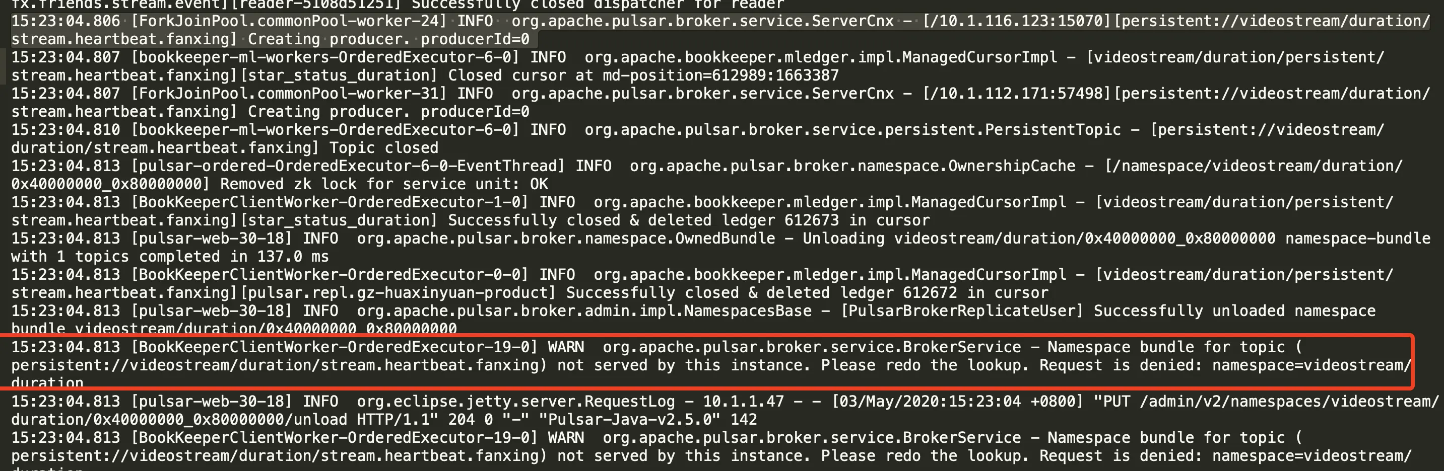 随后我就在log中寻找一些蛛丝马迹,发现确实有namespace bundle unloading之类的日志输出信息基本确认了这问题。