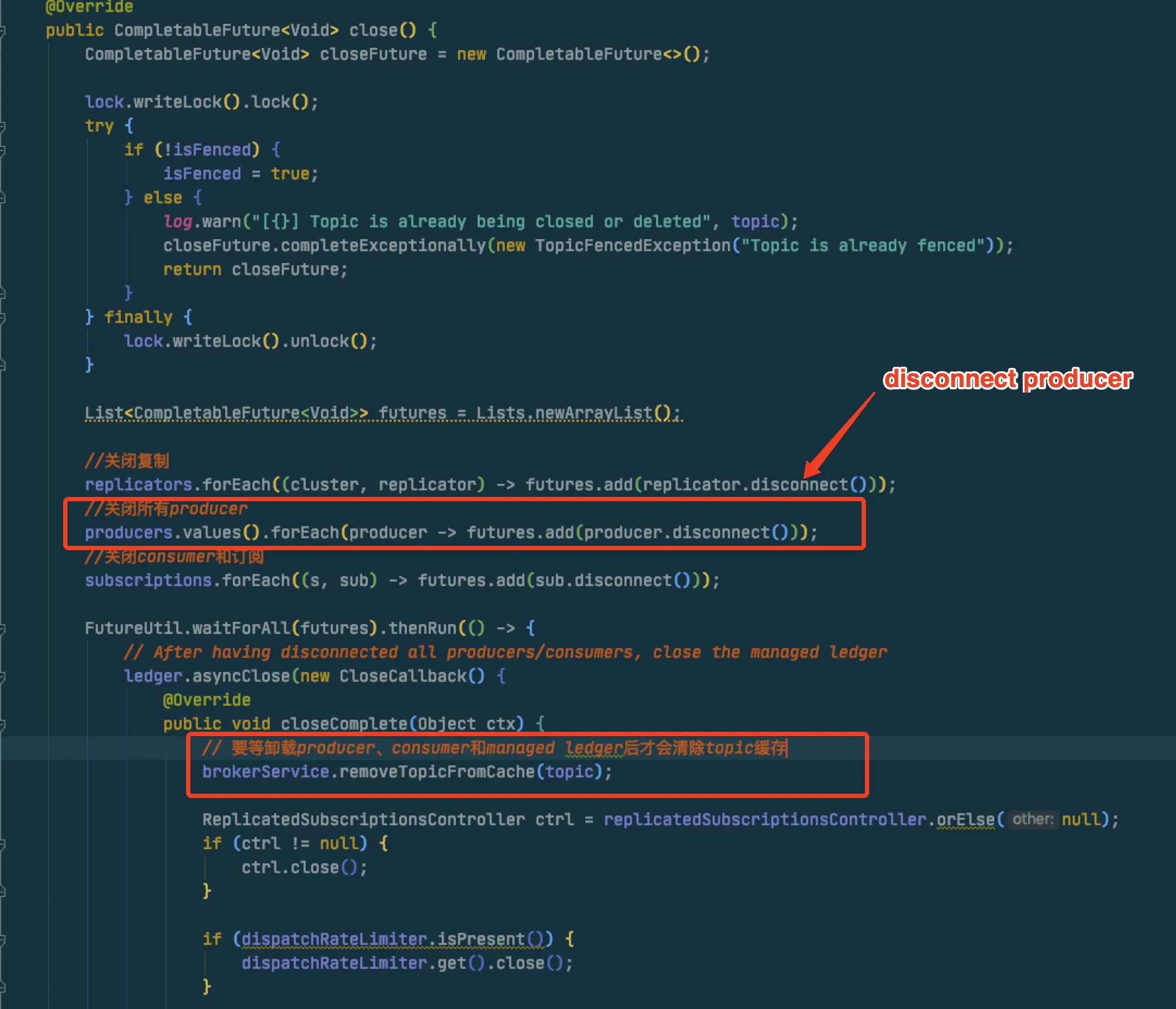 先去unloading逻辑确认下什么时候移除topic缓存,进入PersistentTopic的close方法,从以下代码发现是要等该topic的producer、订阅和consumer、managedLedger都close后才会移除缓存!!