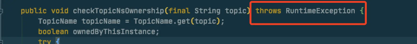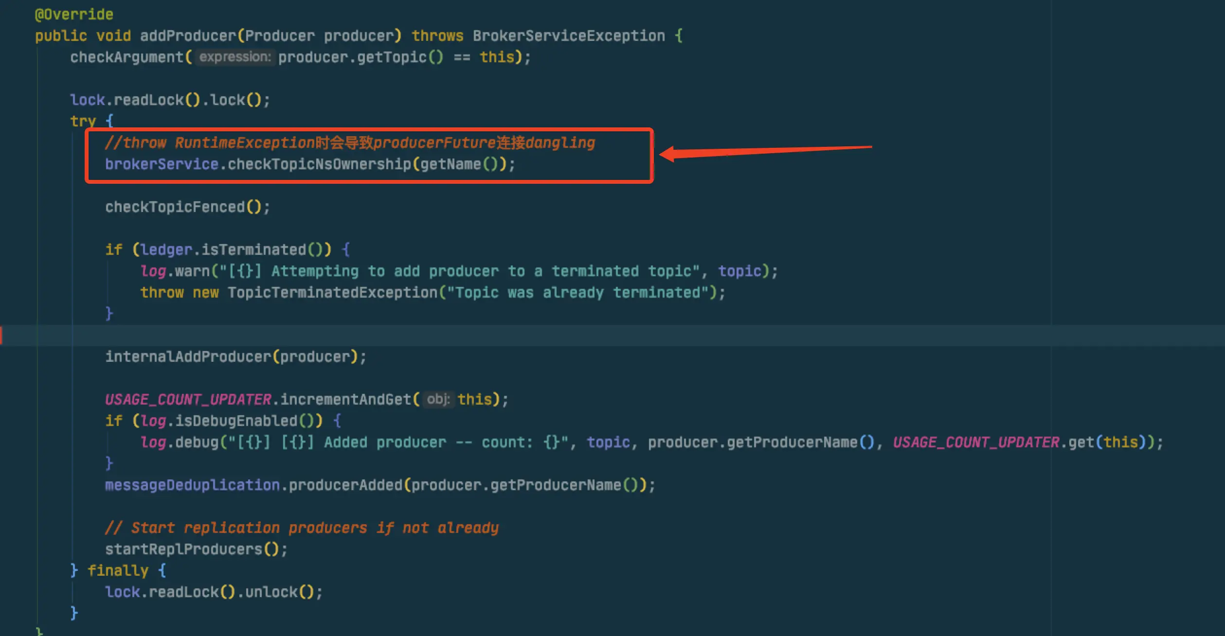topic.addProducer时在拿到了readlock后首先又进行了checkownership的判断,这个方法就是我们前面在2.5中提到的方法,上面说到它会抛出一个runtimeexception!!