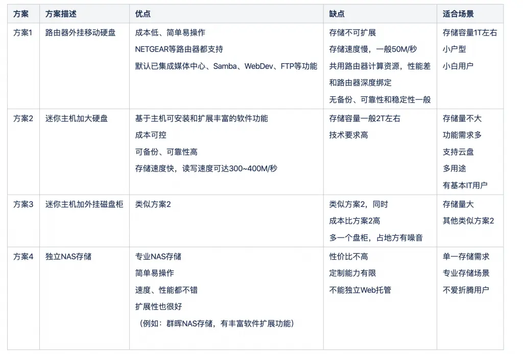 存储设备选型也有比较多的方案,例如: 路由器外挂移动硬盘方案、迷你主机加大硬盘方案、迷你主机外挂磁盘柜、独立NAS存储等,不同方案优缺点比较如下: