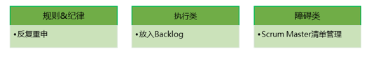 障碍类:是指对团队冲刺形成阻碍的事情,不需要团队成员花时间去改进,可以放入Scrum Master的管理清单中。比如PO在计划会议前准备好Product Backlog,团队白板申请等,这些Scrum Master要和外部团队去沟通协作,并跟进行动的进展。