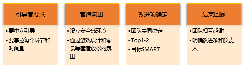 会中可以从引导者要求,营造氛围,改进项确定和结束回顾四个方面来参考。