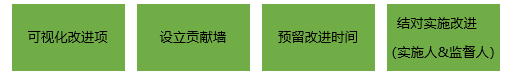 可视化改进项:将改进的内容在团队的公共区域展示出来,让团队都清楚当前处在哪些阶段,需要做什么,如何做,注意什么。
